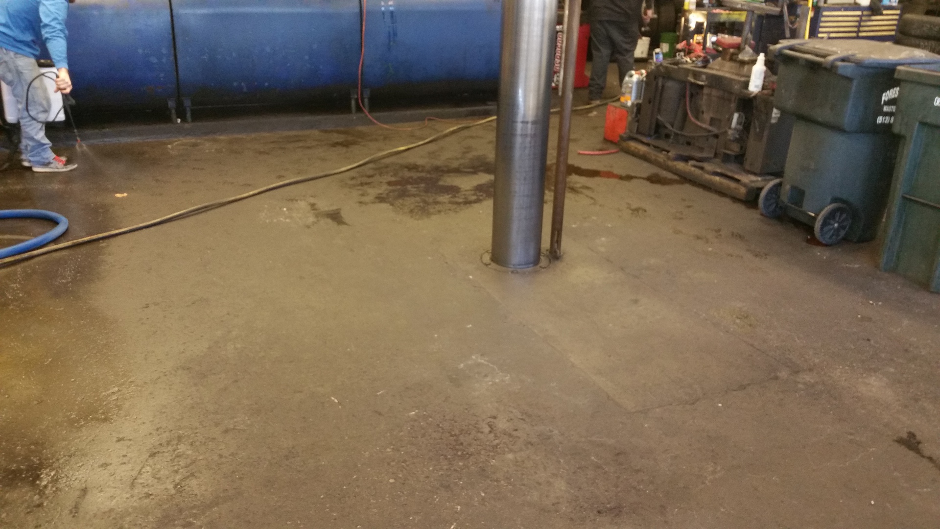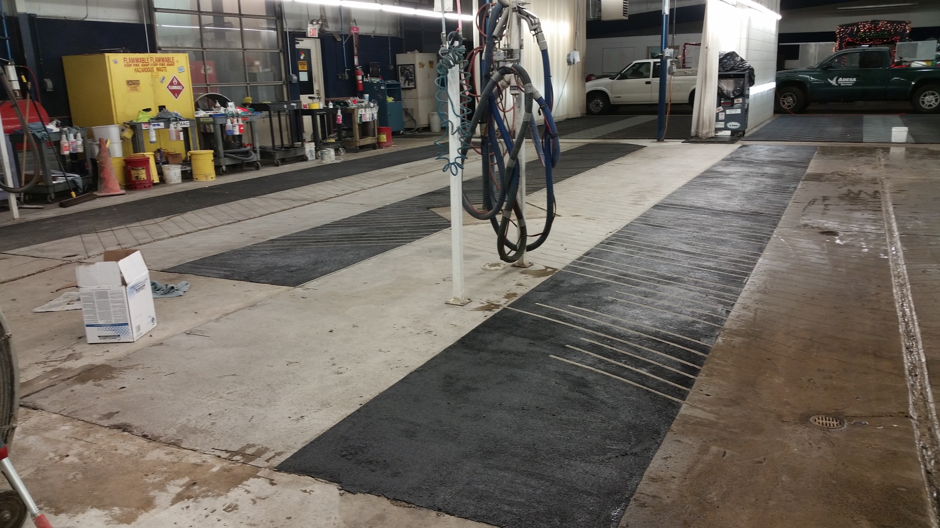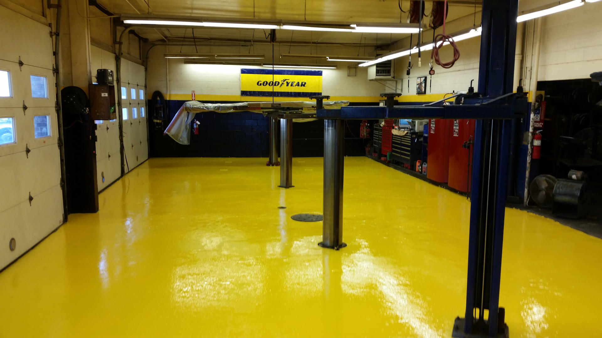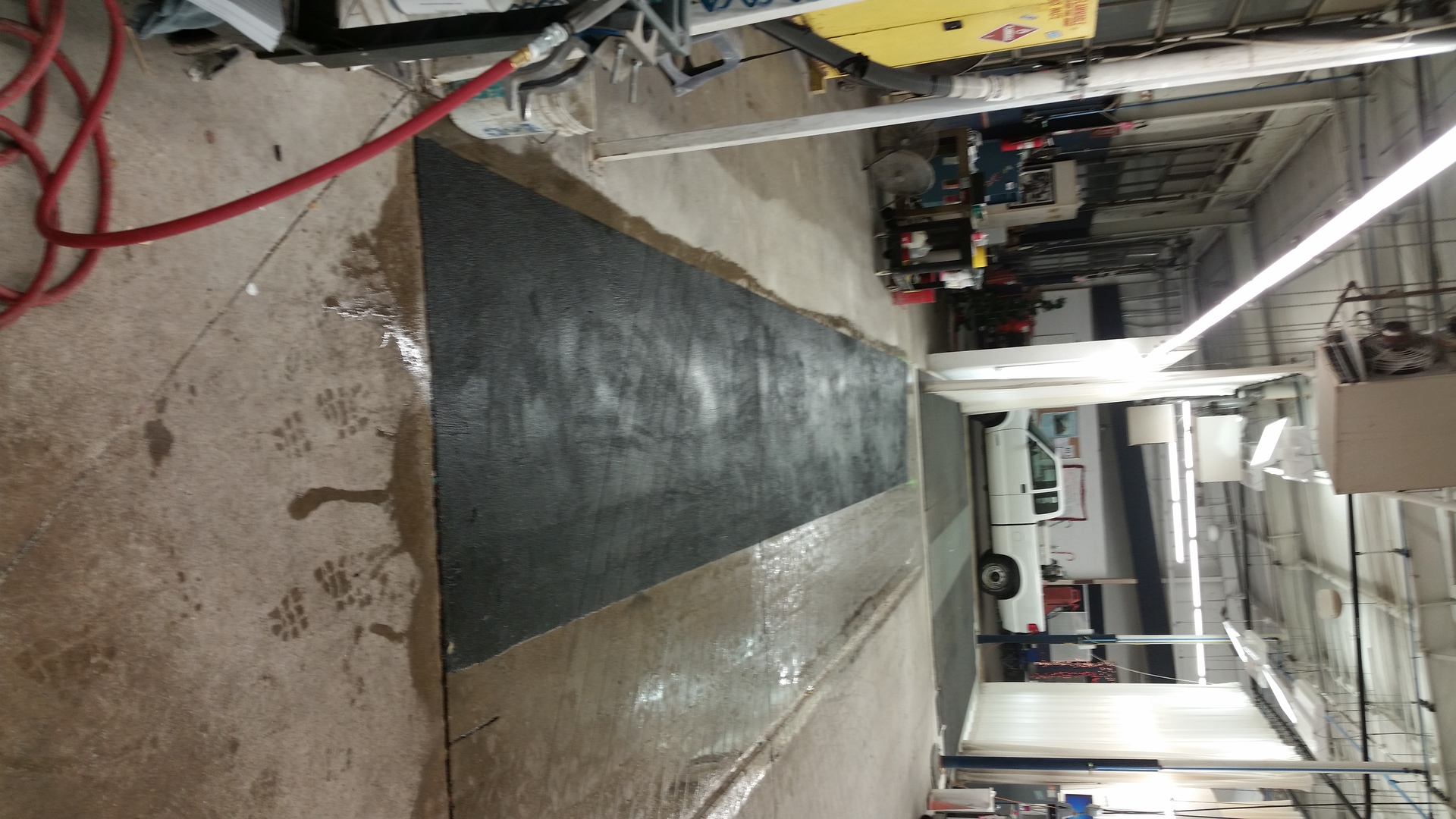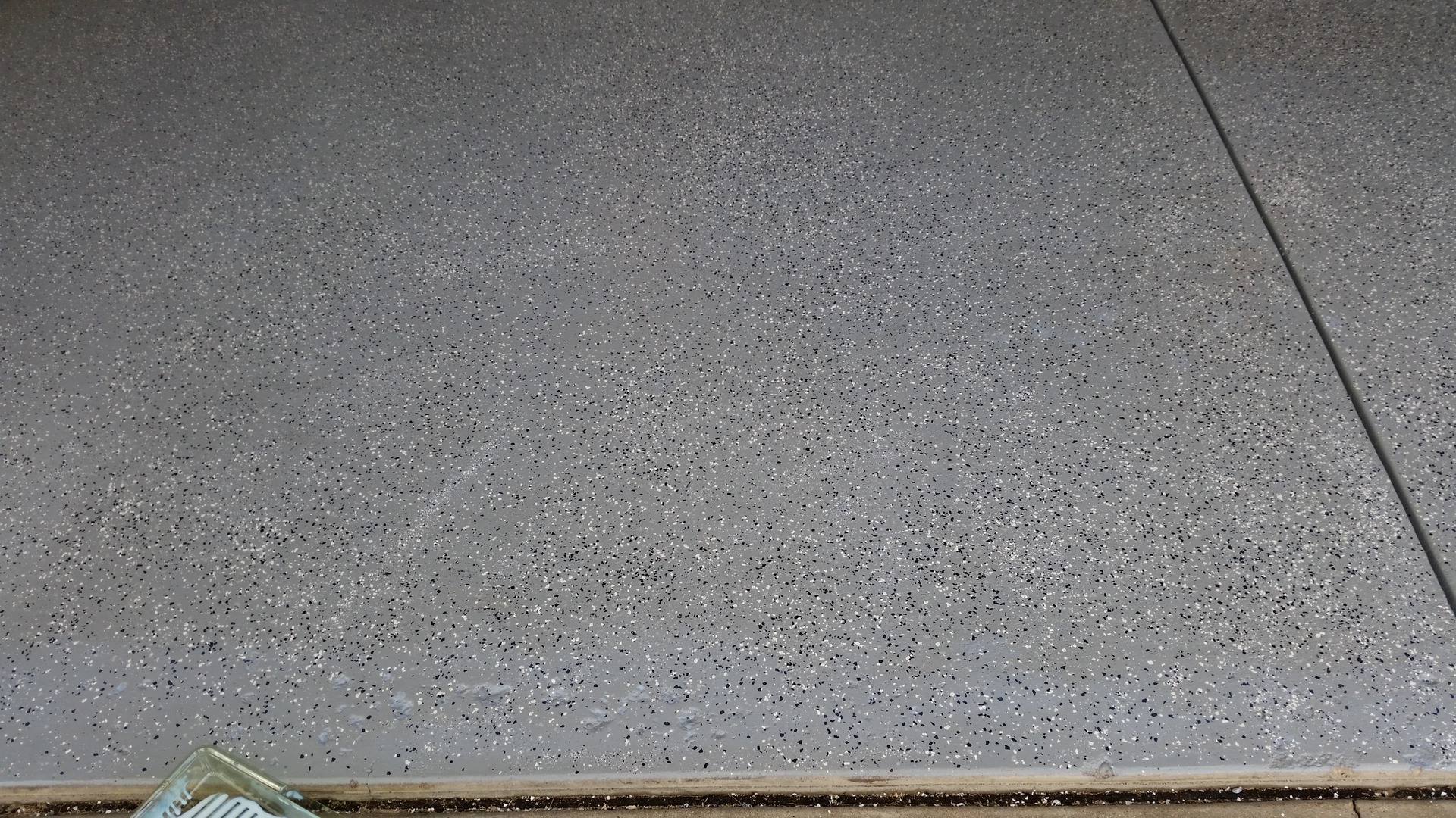 This customer had just paid for his floor to be redone earlier in the year. No top coat was applied and tire mraks were made along with hot tire pickup. We ground away the old paint and applied a new epoxy system with flecking. Then we applied a top coat to protect the appearance and increase the durability of the floor.