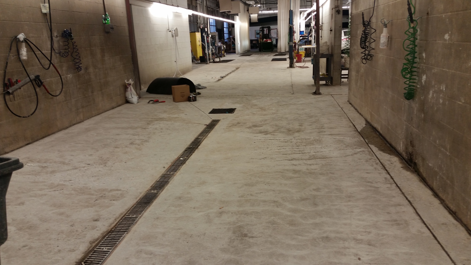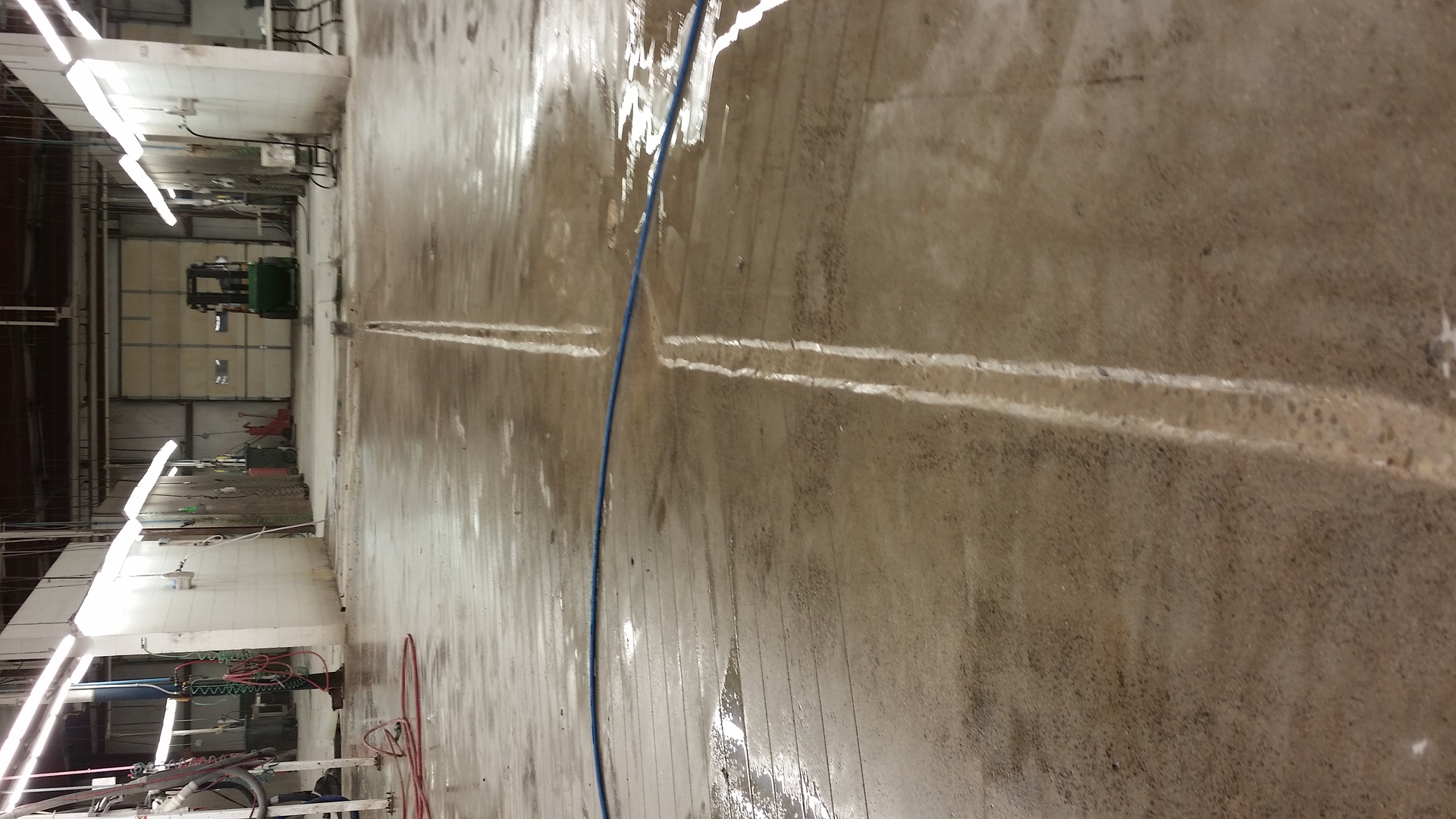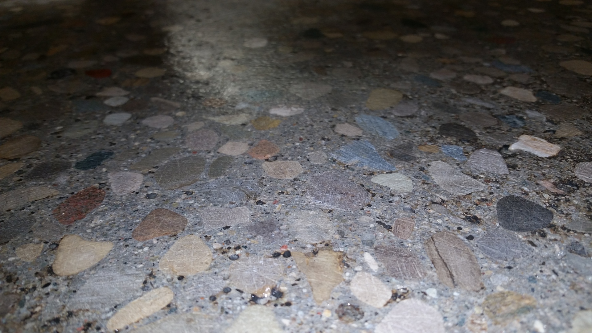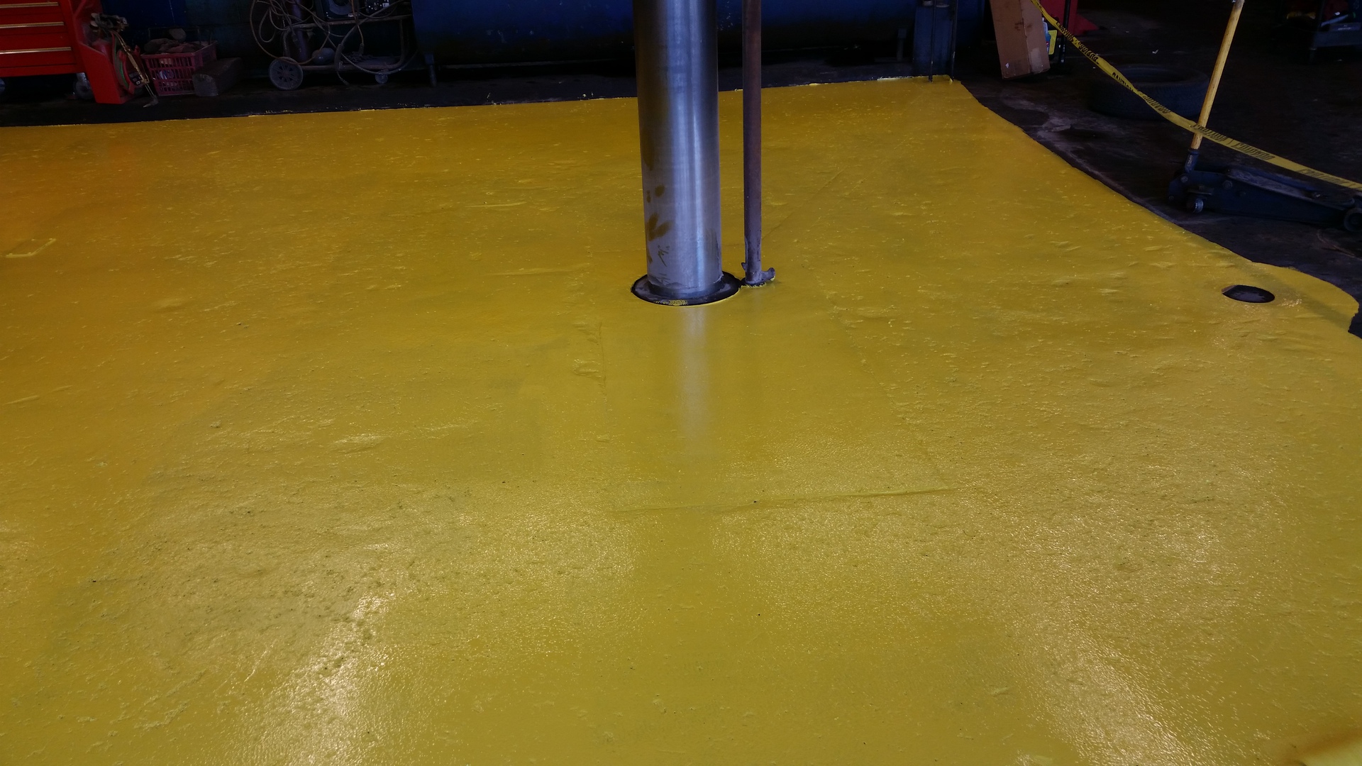 This customer had just paid for his floor to be redone earlier in the year. No top coat was applied and tire mraks were made along with hot tire pickup. We ground away the old paint and applied a new epoxy system with flecking. Then we applied a top coat to protect the appearance and increase the durability of the floor.