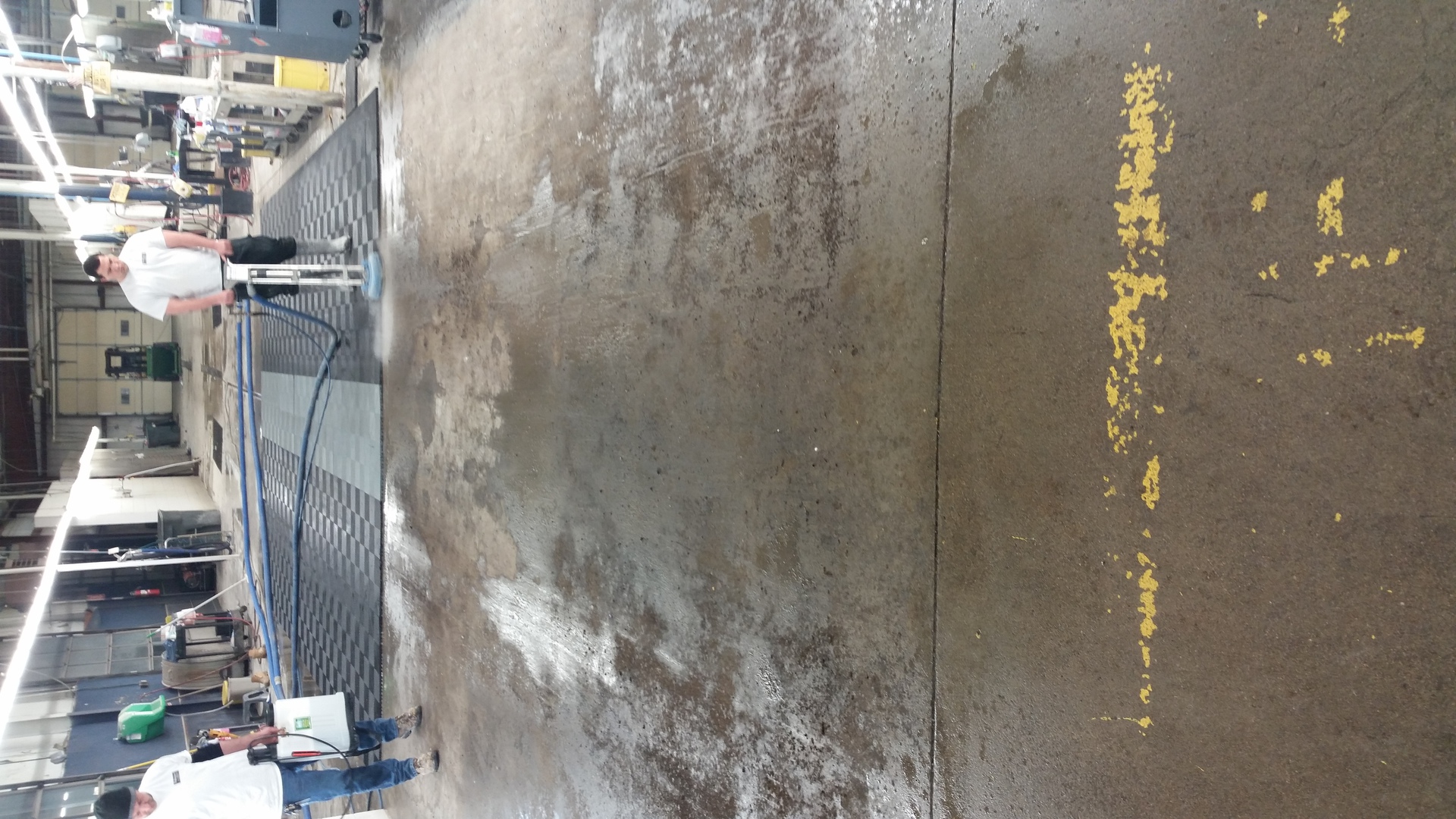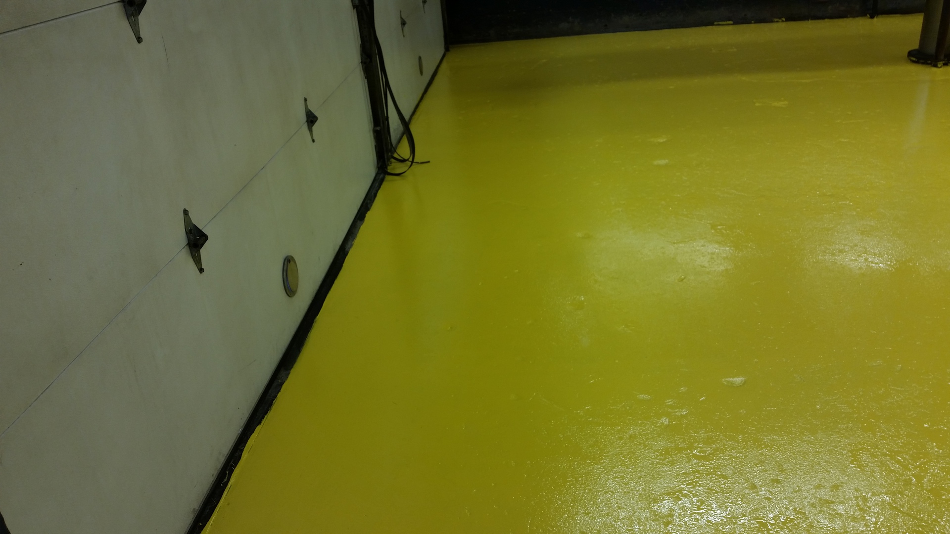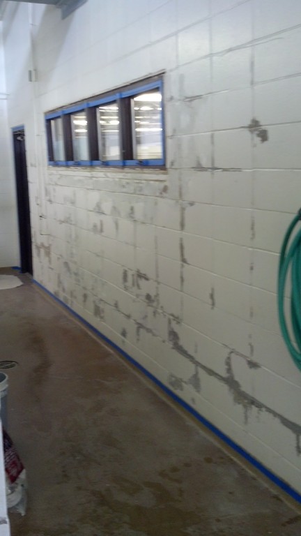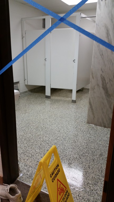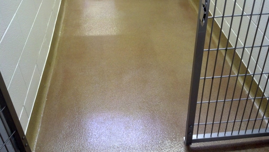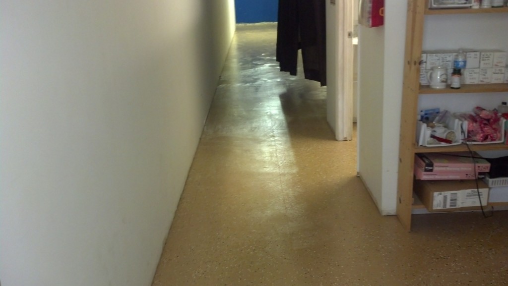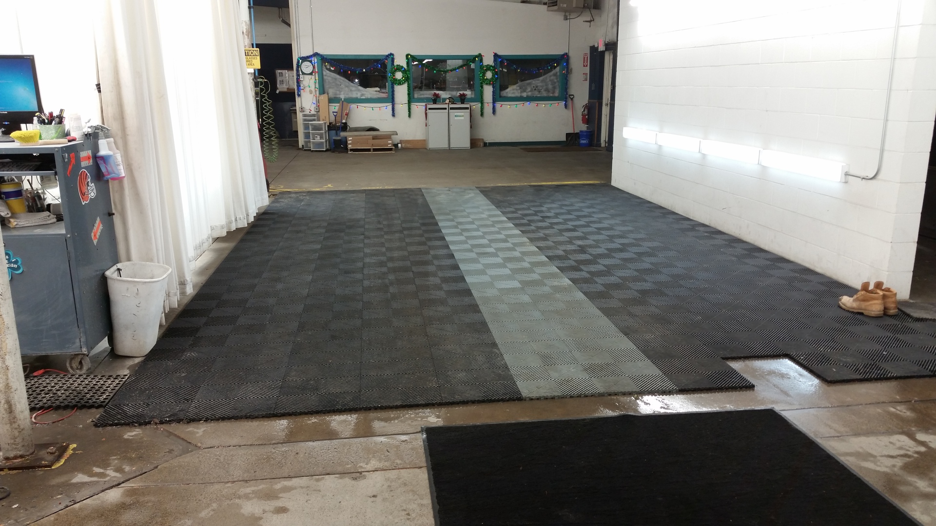 This customer had just paid for his floor to be redone earlier in the year. No top coat was applied and tire mraks were made along with hot tire pickup. We ground away the old paint and applied a new epoxy system with flecking. Then we applied a top coat to protect the appearance and increase the durability of the floor.