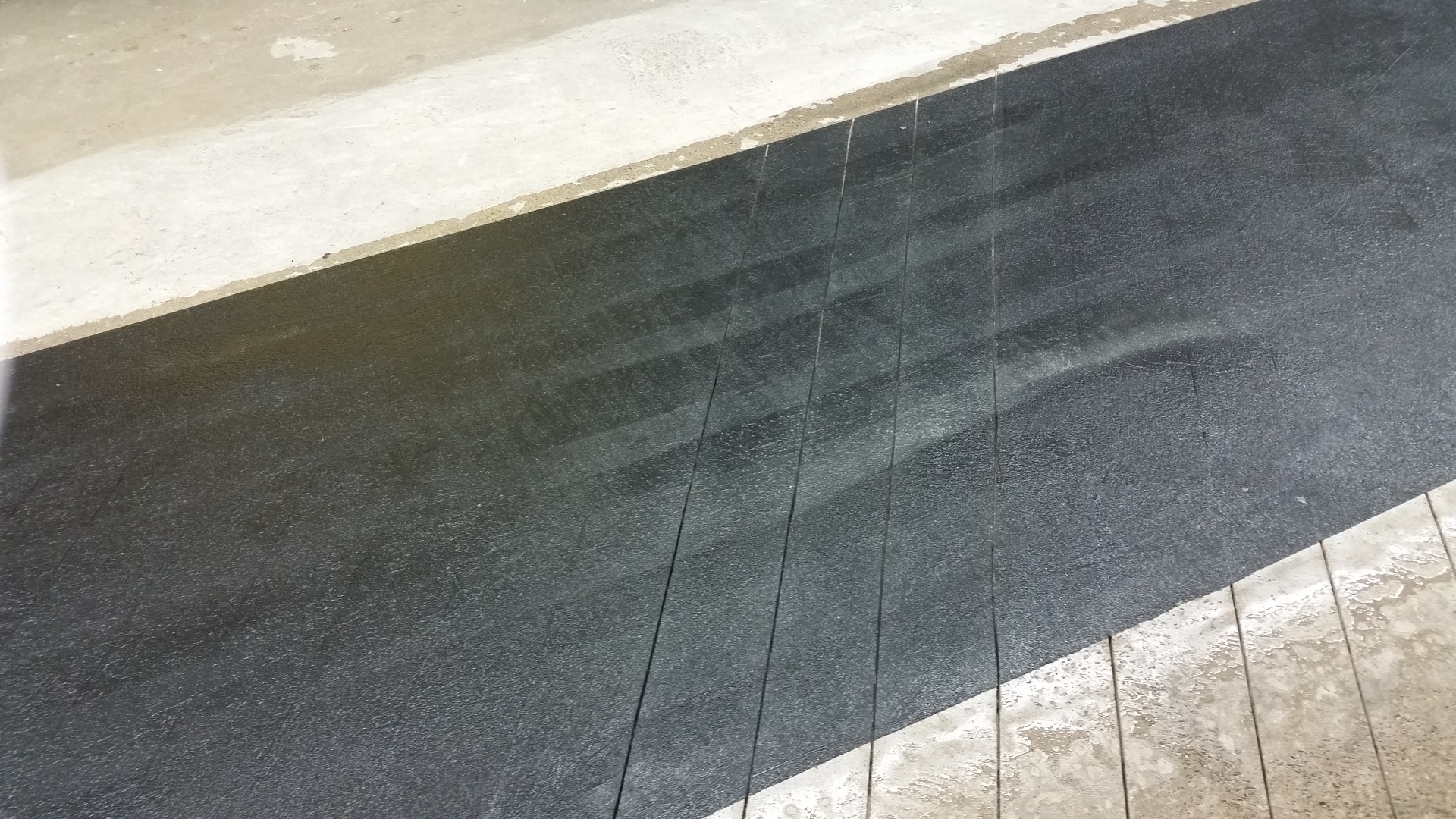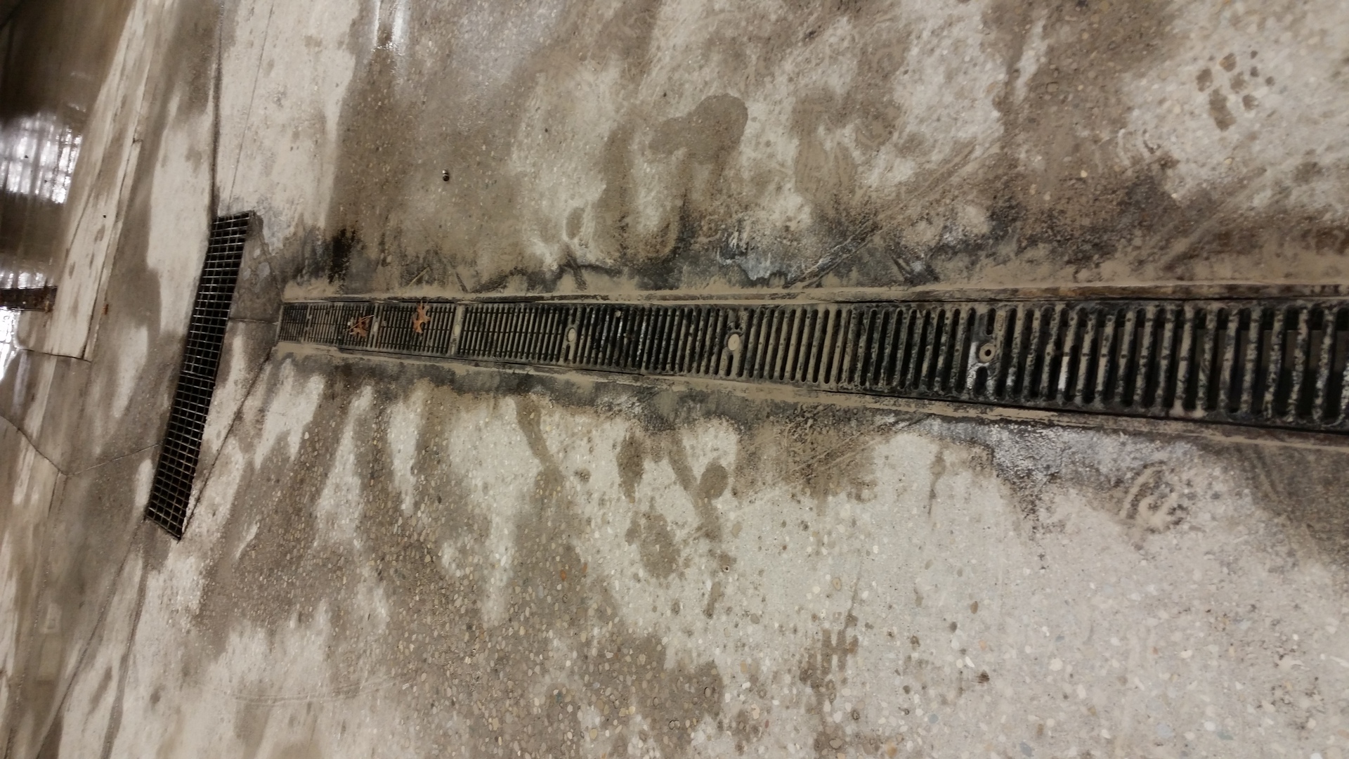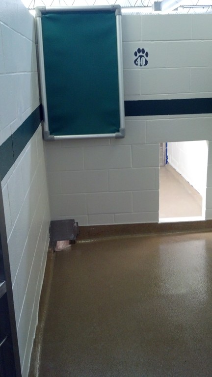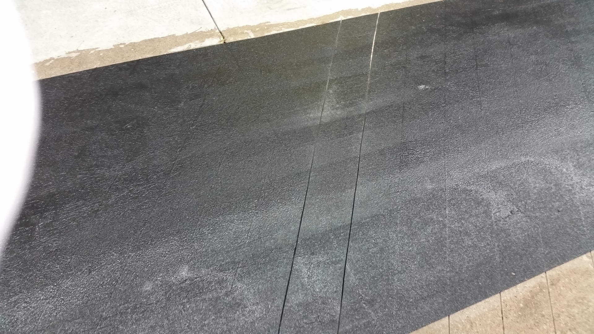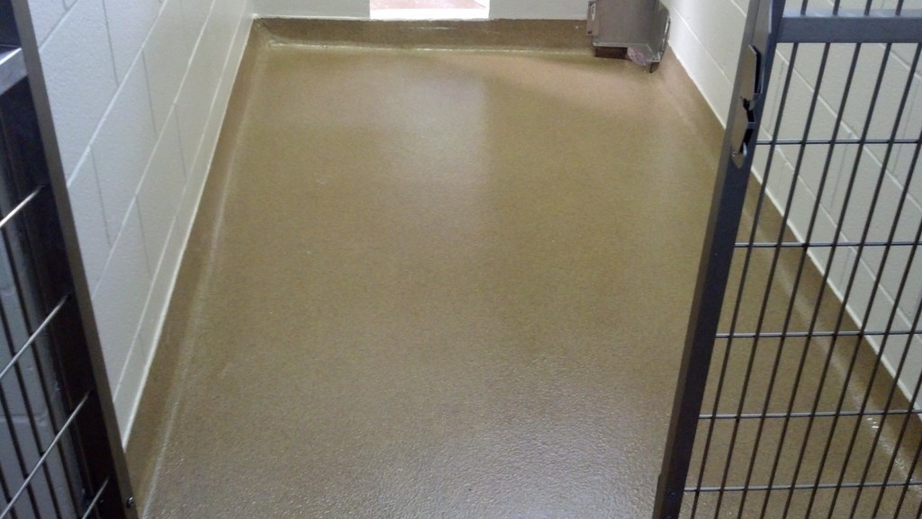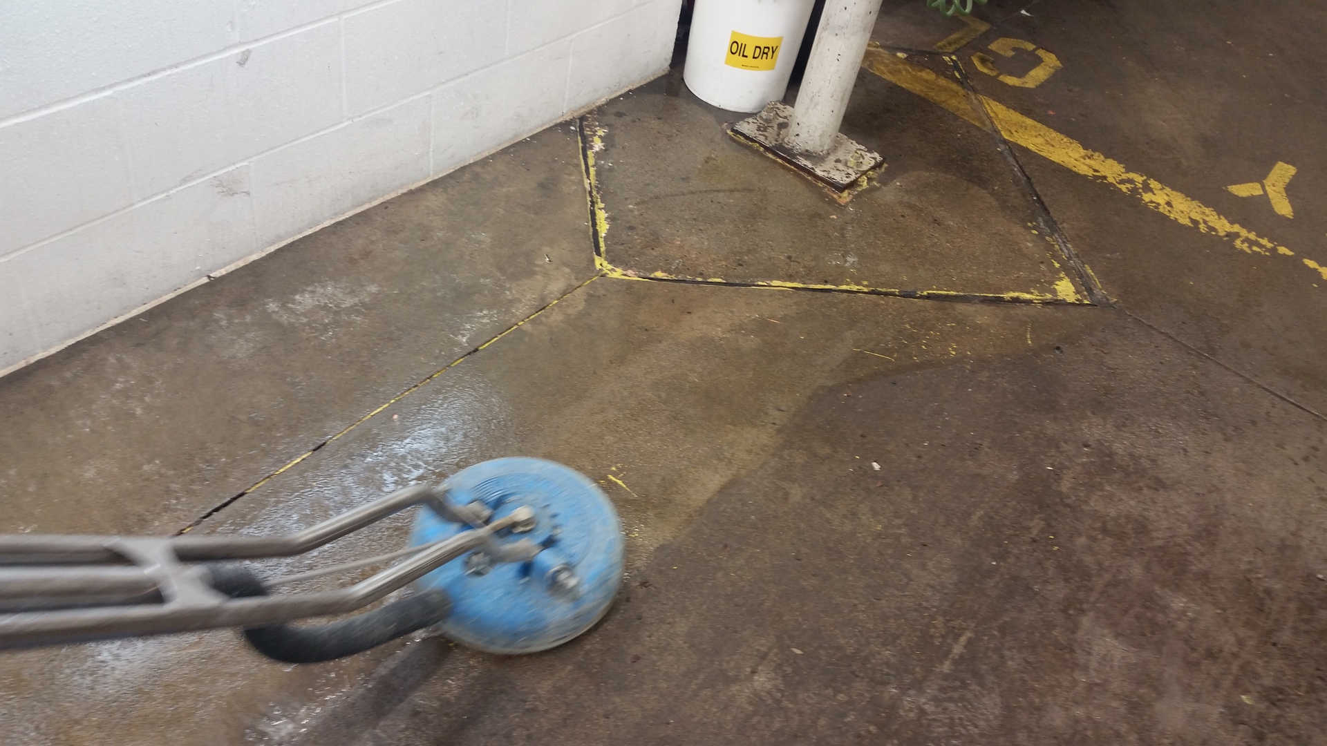 This customer had just paid for his floor to be redone earlier in the year. No top coat was applied and tire mraks were made along with hot tire pickup. We ground away the old paint and applied a new epoxy system with flecking. Then we applied a top coat to protect the appearance and increase the durability of the floor.