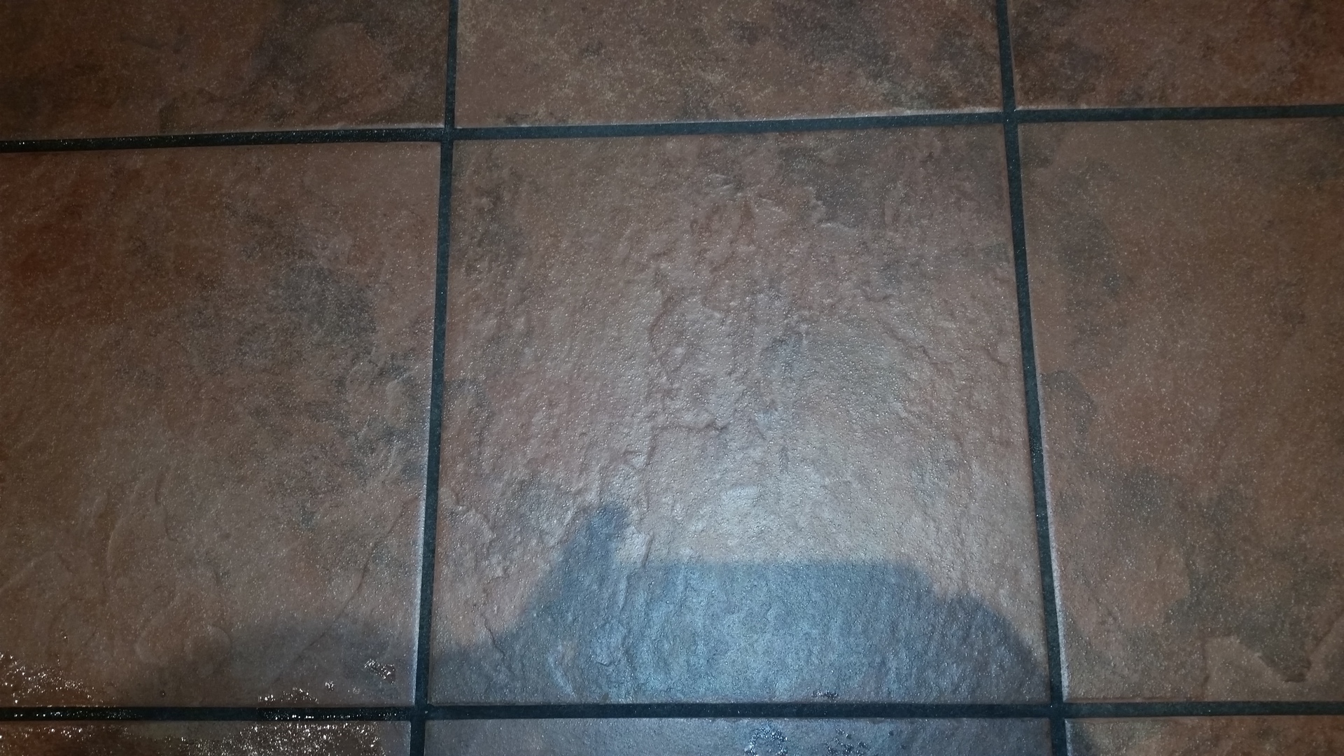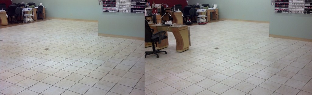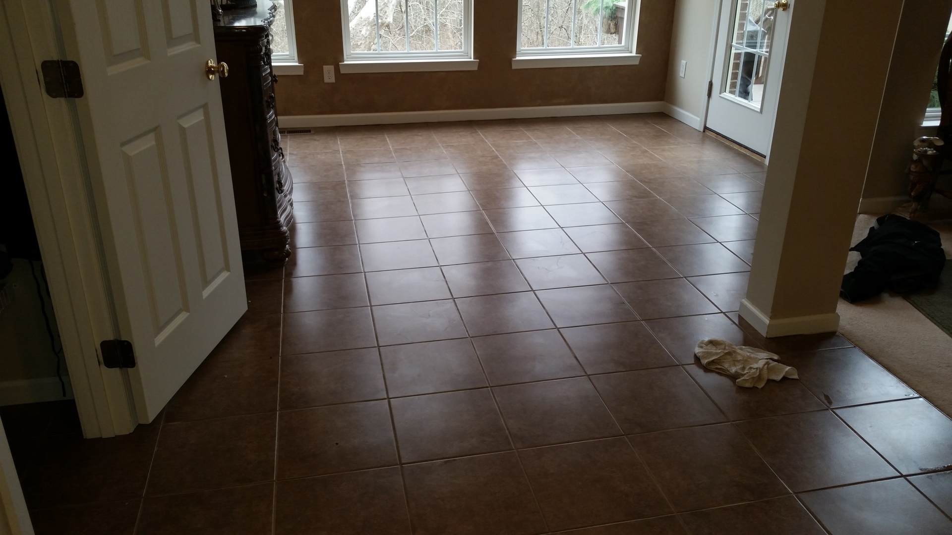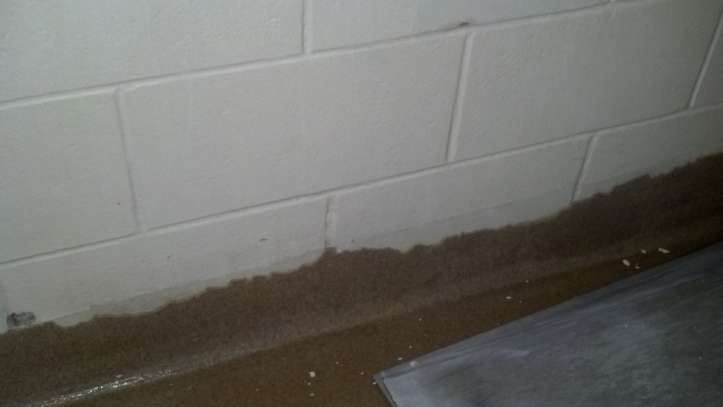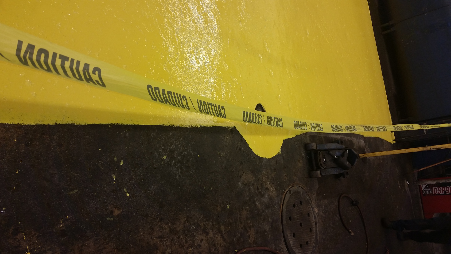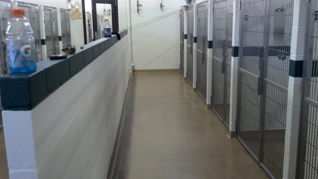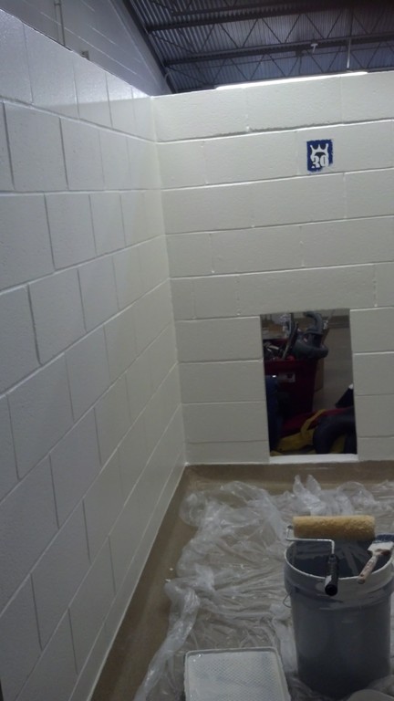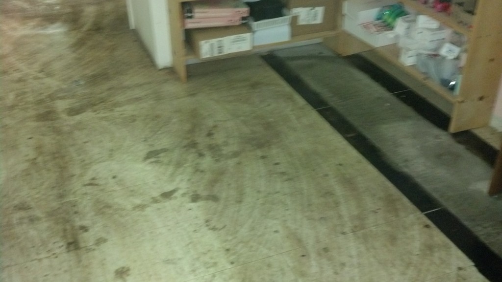 This customer had just paid for his floor to be redone earlier in the year. No top coat was applied and tire mraks were made along with hot tire pickup. We ground away the old paint and applied a new epoxy system with flecking. Then we applied a top coat to protect the appearance and increase the durability of the floor.