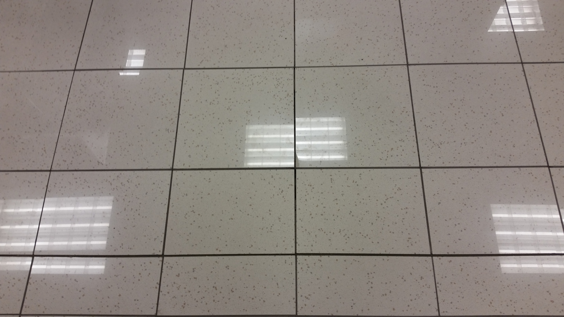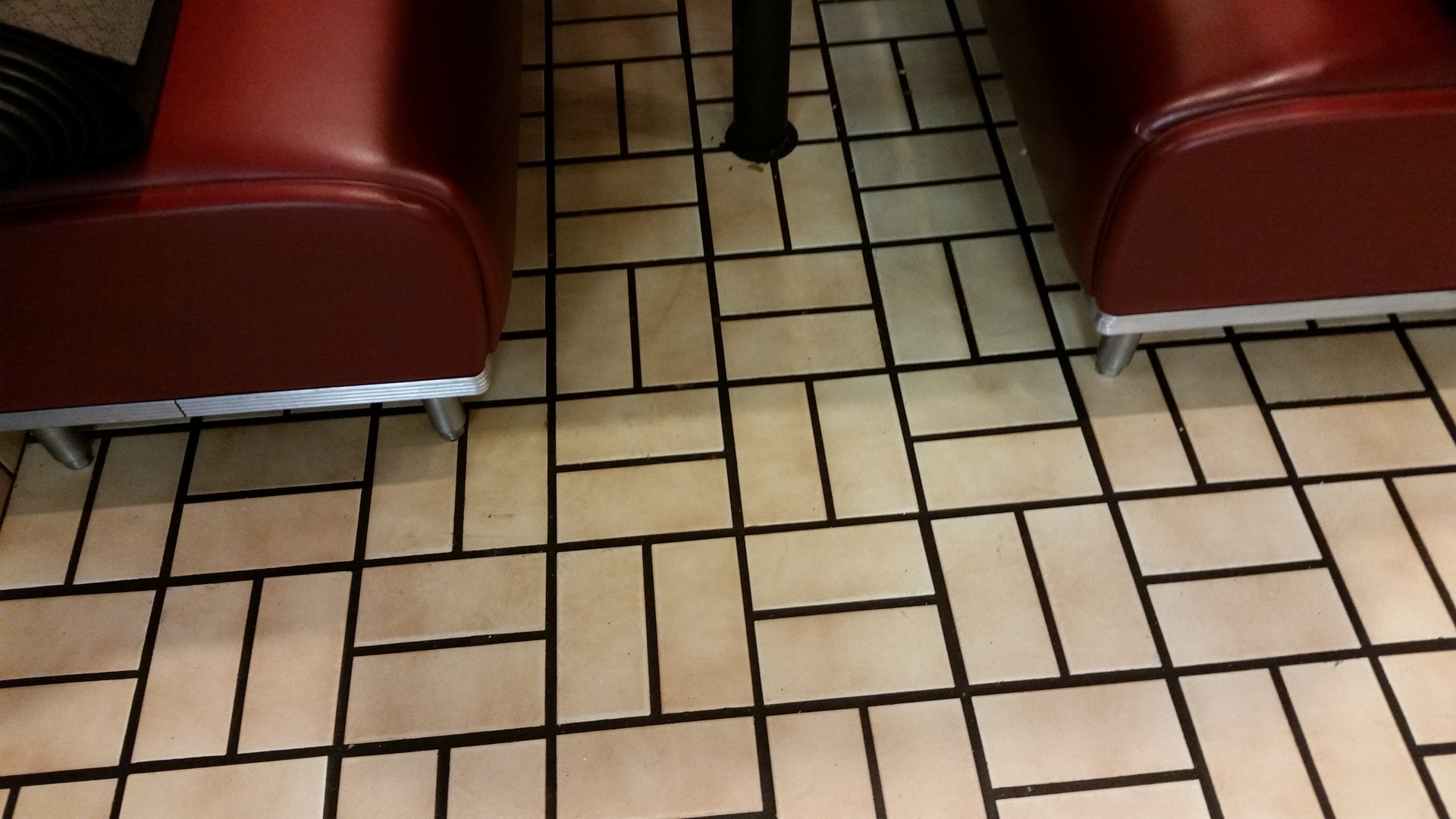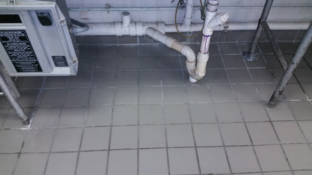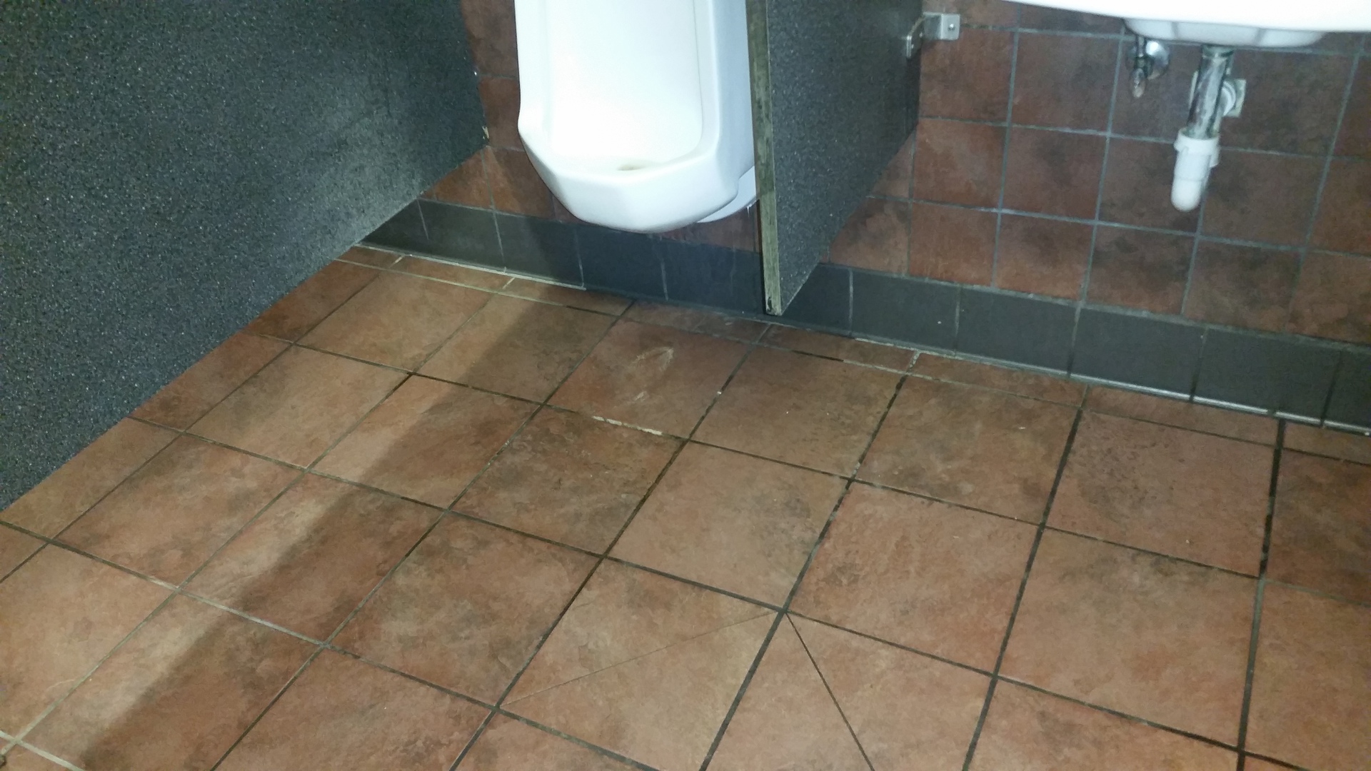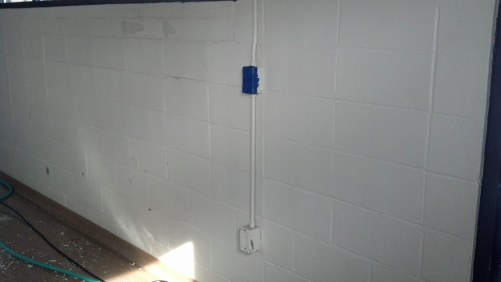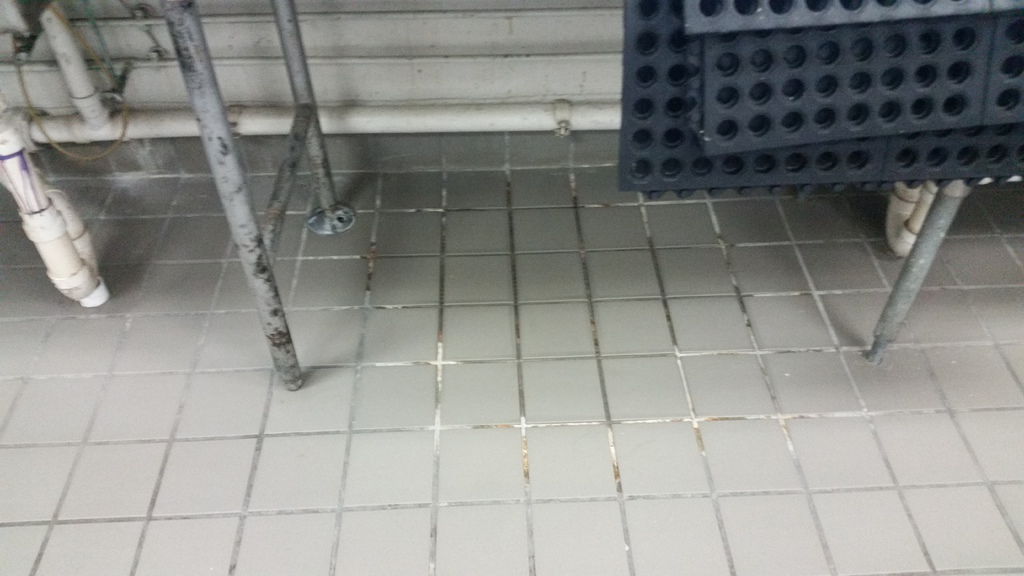 This customer had just paid for his floor to be redone earlier in the year. No top coat was applied and tire mraks were made along with hot tire pickup. We ground away the old paint and applied a new epoxy system with flecking. Then we applied a top coat to protect the appearance and increase the durability of the floor.